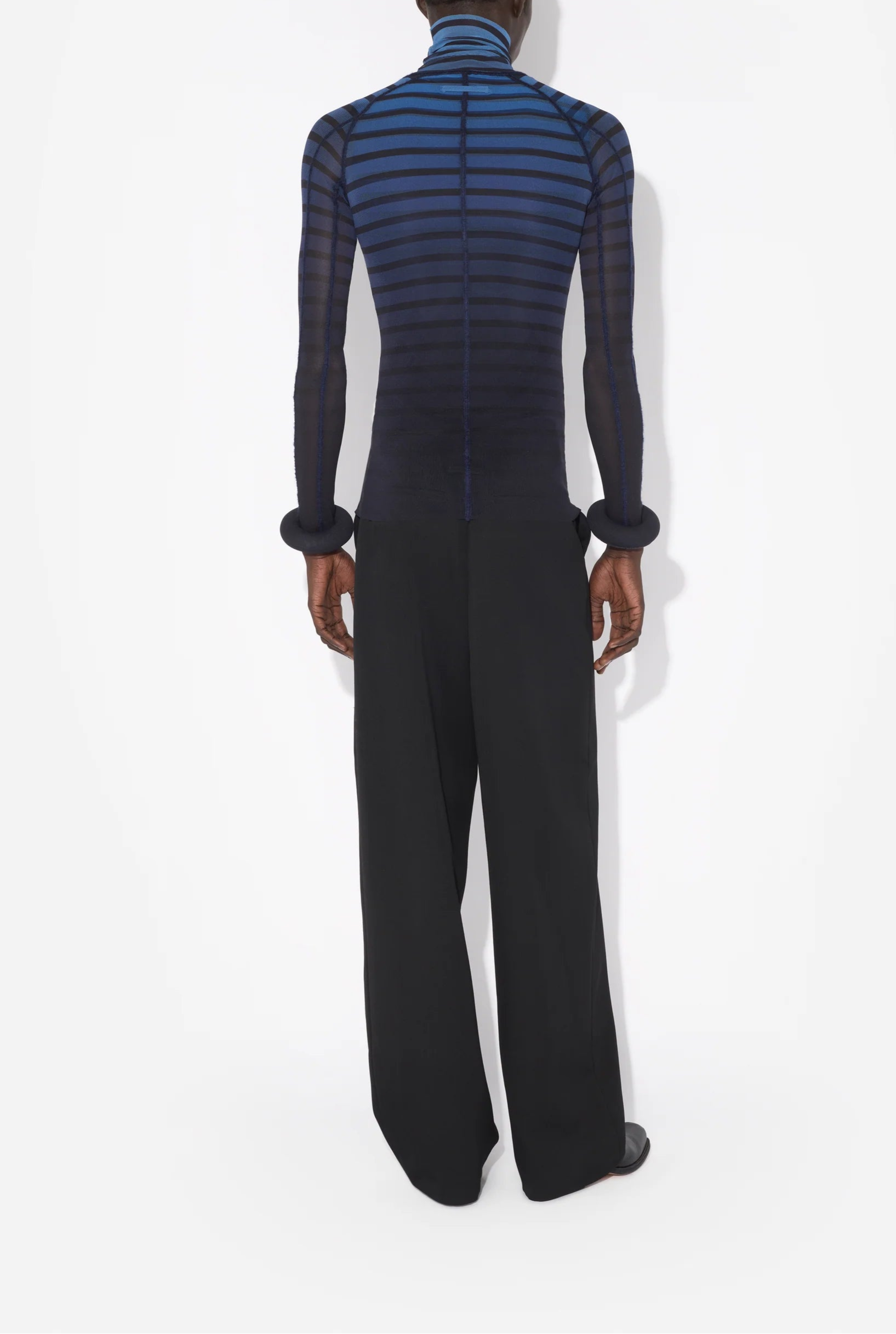 This unisex Jean Paul Gaultier semi-sheer long sleeve turtleneck top features a striped pattern throughout.