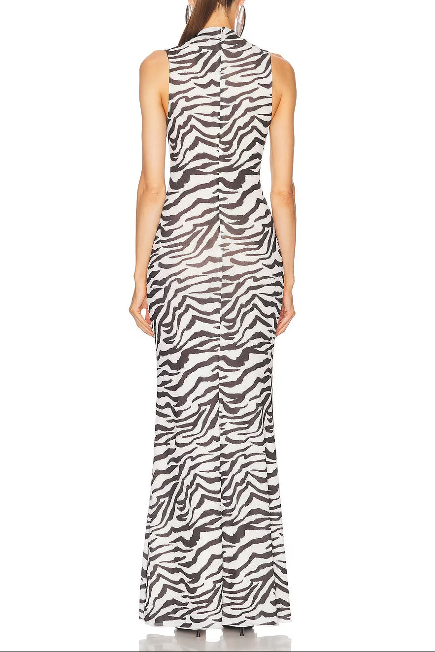 A bold, body-skimming silhouette with effortless impact. The Ronny Kobo Morell Dress features an allover zebra print, sleeveless mock-neck design, and stretch fabric that contours the body while remaining comfortable and fluid. The elongated maxi length delivers sleek drama with minimal effort.