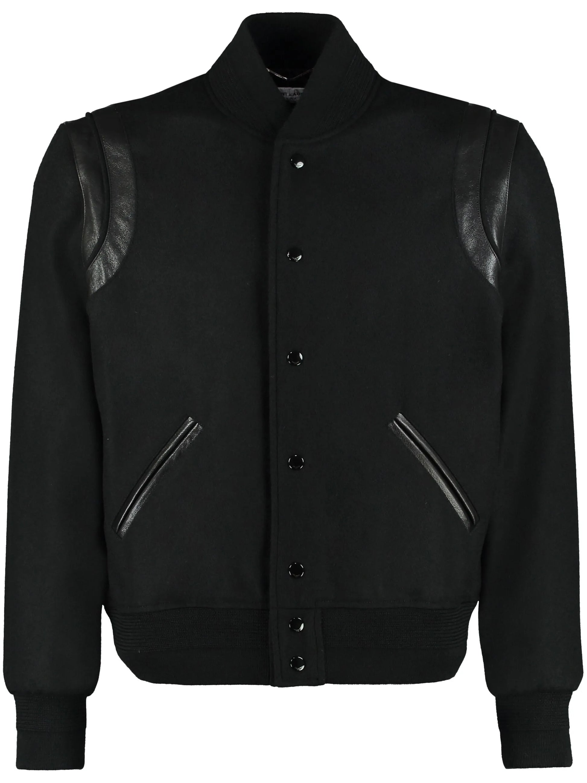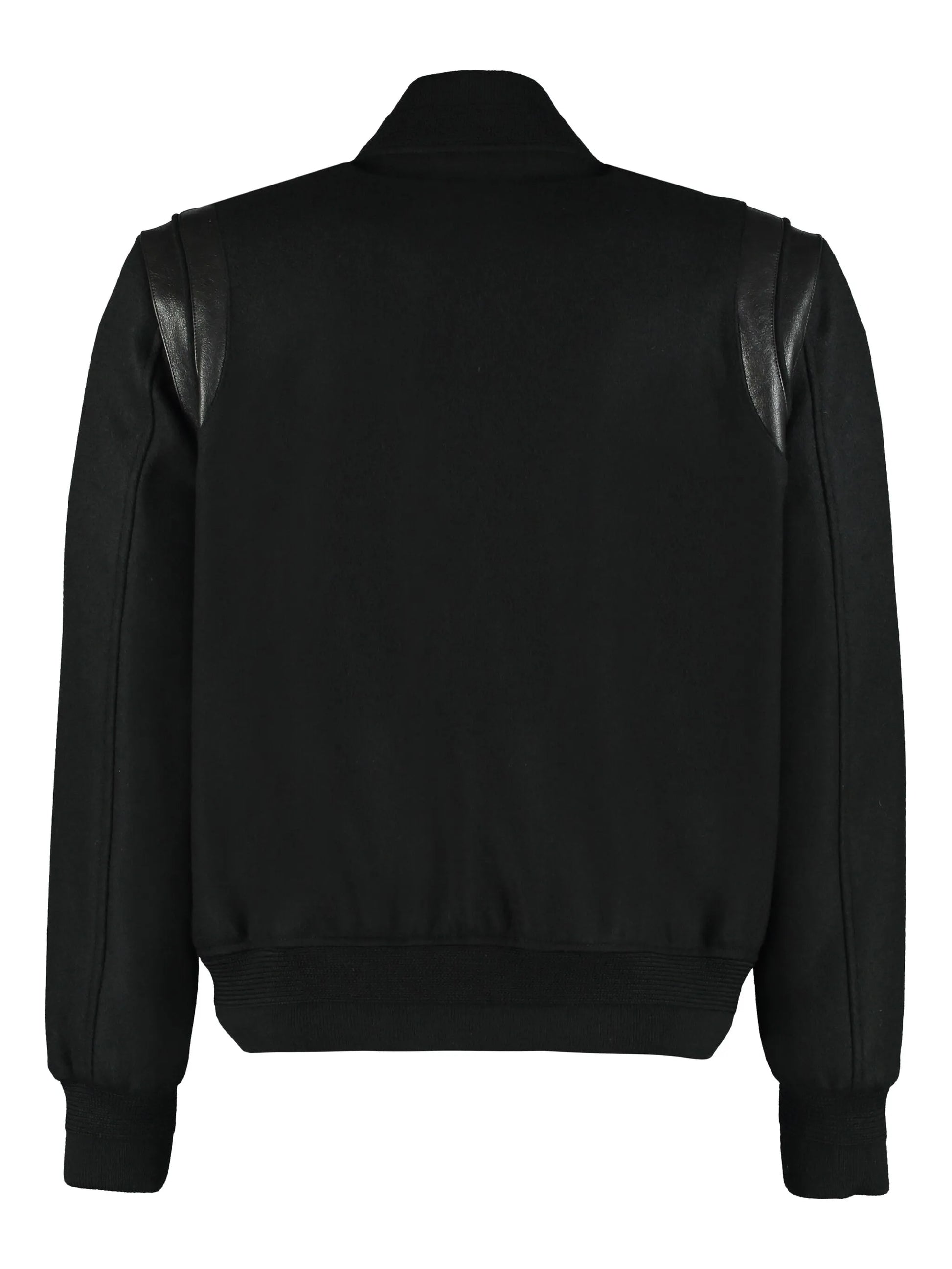 SAINT LAURENT LEATHER TRIM TEDDY VARSITY JACKET