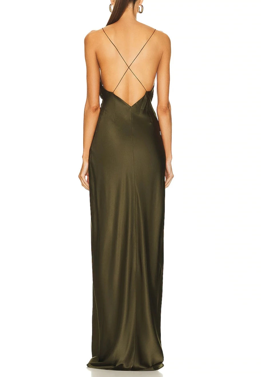 This sexy silk dress is cut to flatter the frame, and with a thigh-high slit and floorlength hem, it's both sophisticated and sexy.